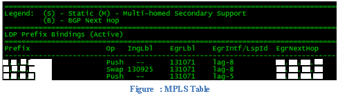 Using Label Distribution Protocol (LDP) routers distribute their labels. LDP is not a routing protocol as OSPF (Open Shortest Path First) or IS-IS (Intermediate System to Intermediate System). As in previous case (in IP routing) in MPLS routers build two tables namely LIB (Label Information Base) and LIFB (Label Information Forwarding Base). LIB consists of labels of connected networks. And LIFB consist of label mapping of the networks. No data loss occurs as in previous case, only label switching happens. Now a large table with labels build up. To overcome, we can use a protocol like BGP (Border Gateway Protocol). Following figure will give you an idea of how a LFIB – MPLS table looks like.